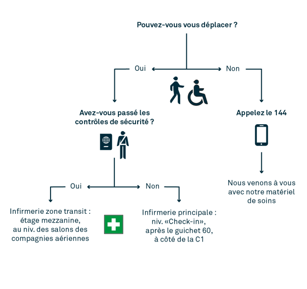 L'infirmerie de Genève Aéroport est un service gratuit mis à disposition des passagers et du personnel de la plateforme aéroportuaire. Cette prestation est assurée par une équipe de 9 infirmiers et infirmières expérimentés travaillant en binôme.